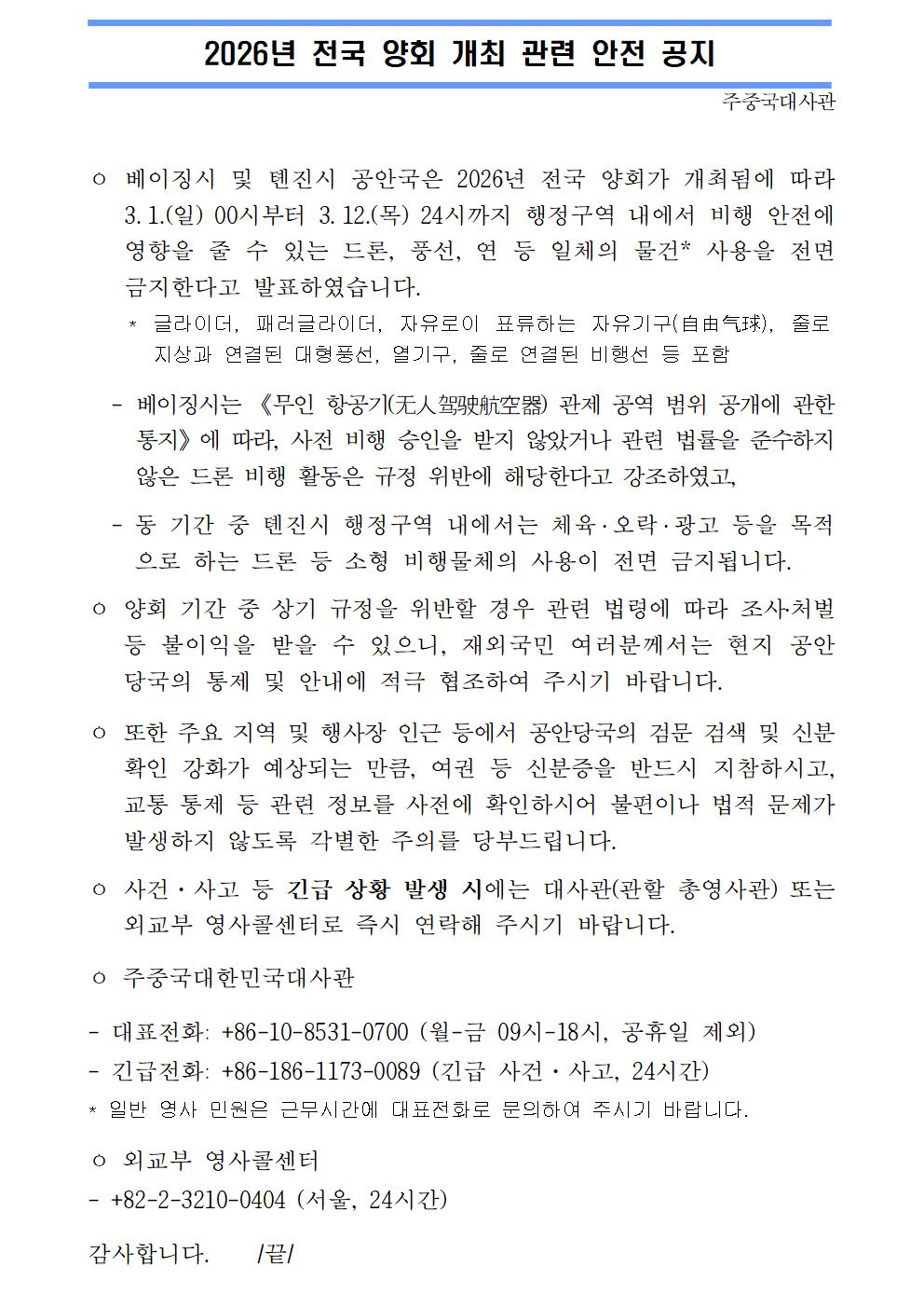 2026년 전국 양회 개최 관련 안전 공지