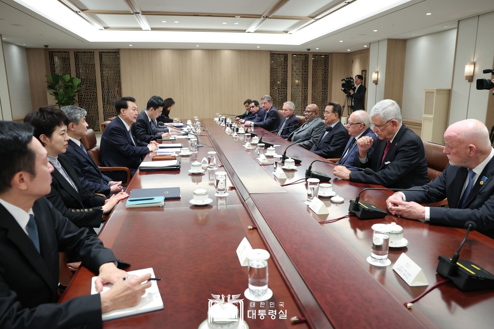 윤석열 대통령은 10. 18(수) 오후 전·현직 유엔 총회의장들로 구성된 유엔총회의장협의회(UNCPGA : Council of the Presidents of the United Nations General Assembly) 의장(한승수 前 국무총리) 및 대표단을 접견하고, 주요 국제 현안과 한반도 상황 등에 대해 의견을 교환했습니다.