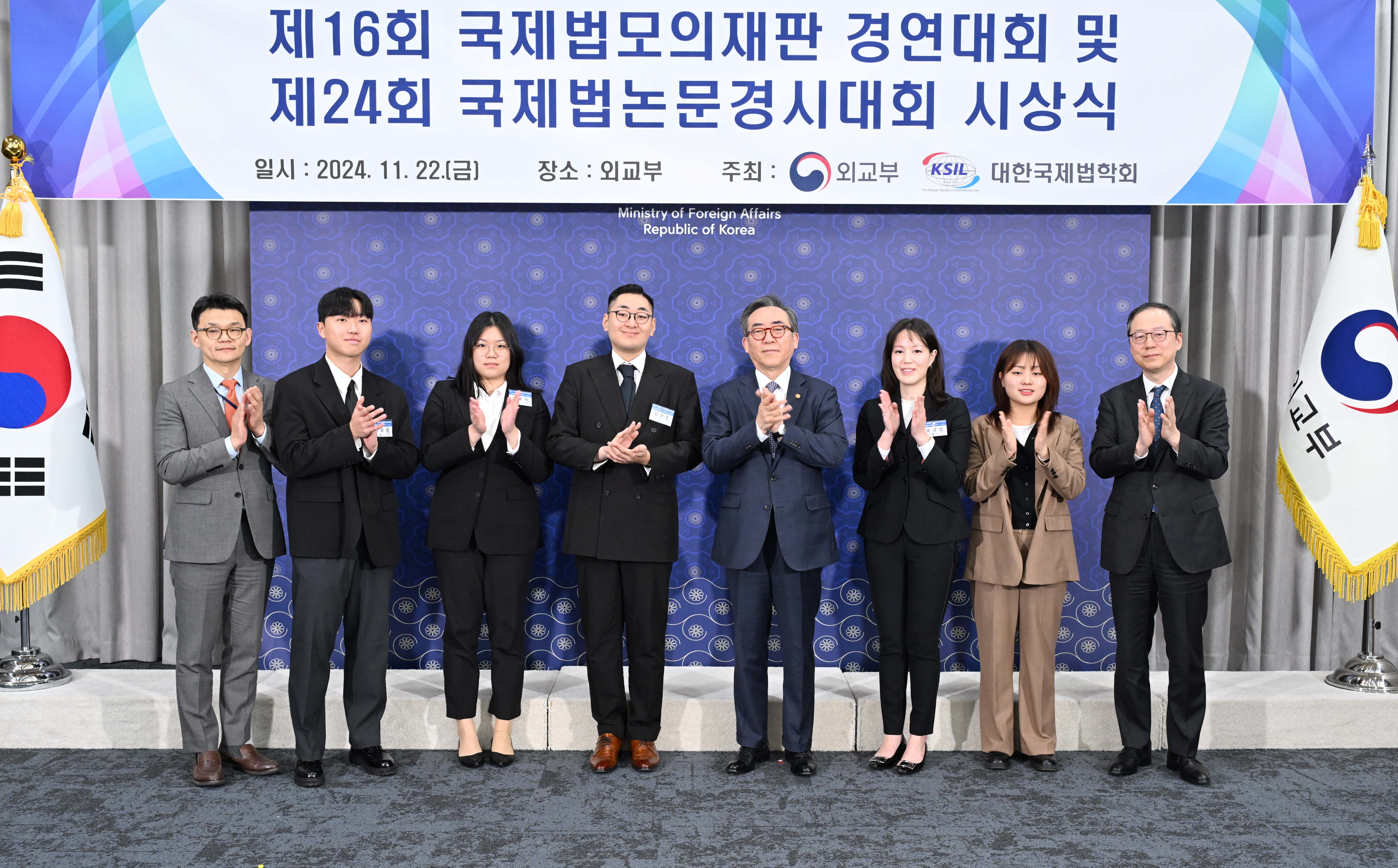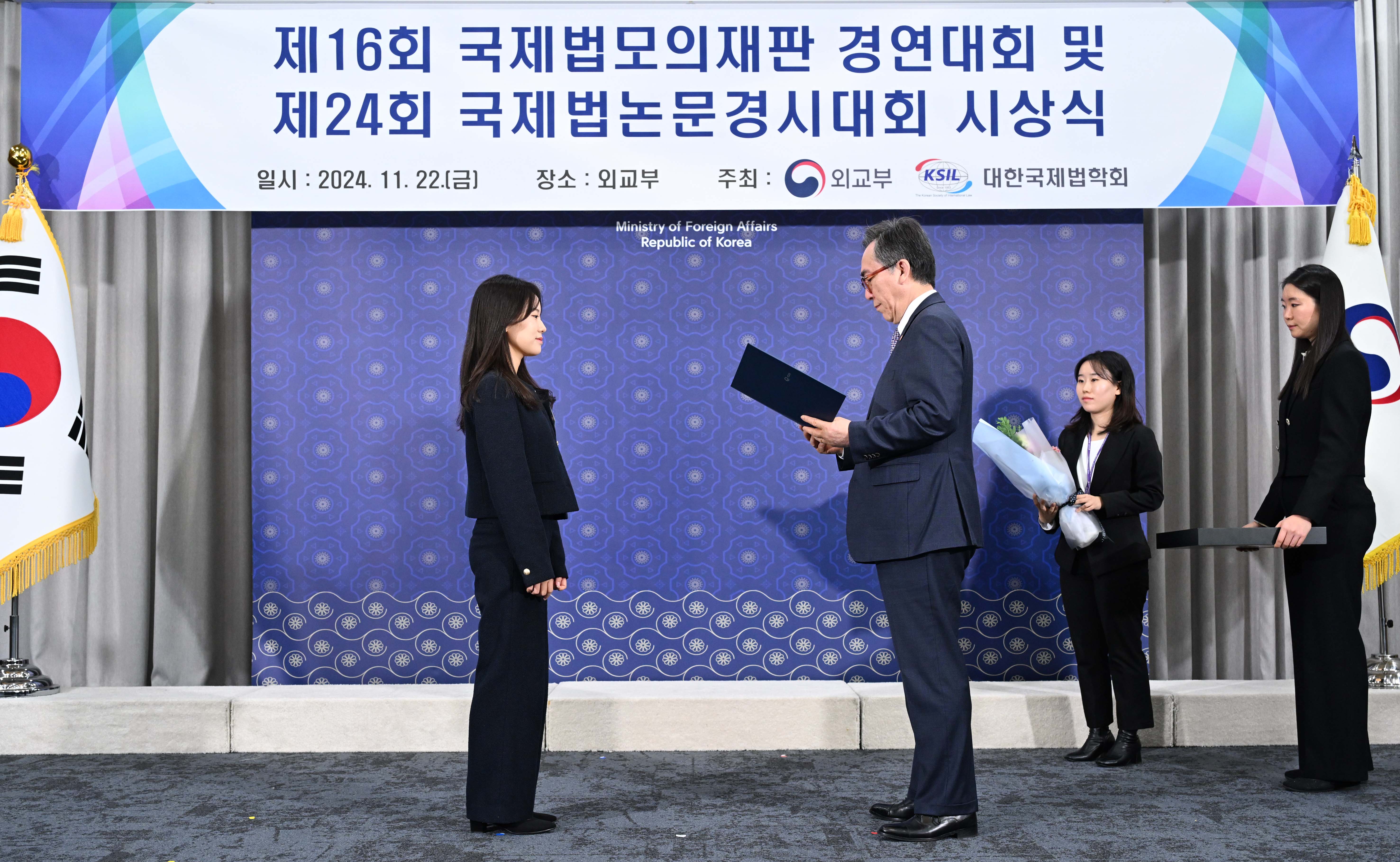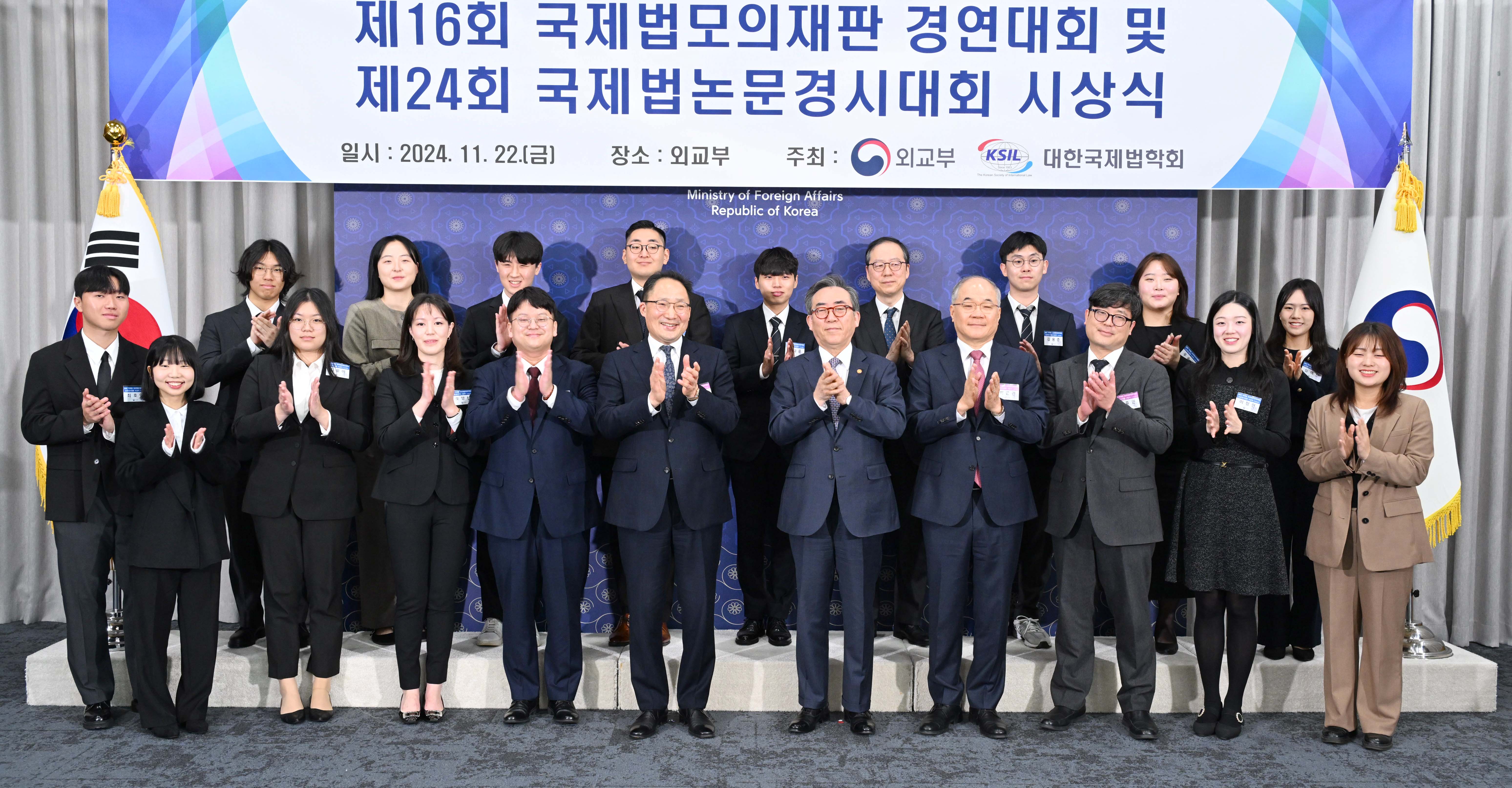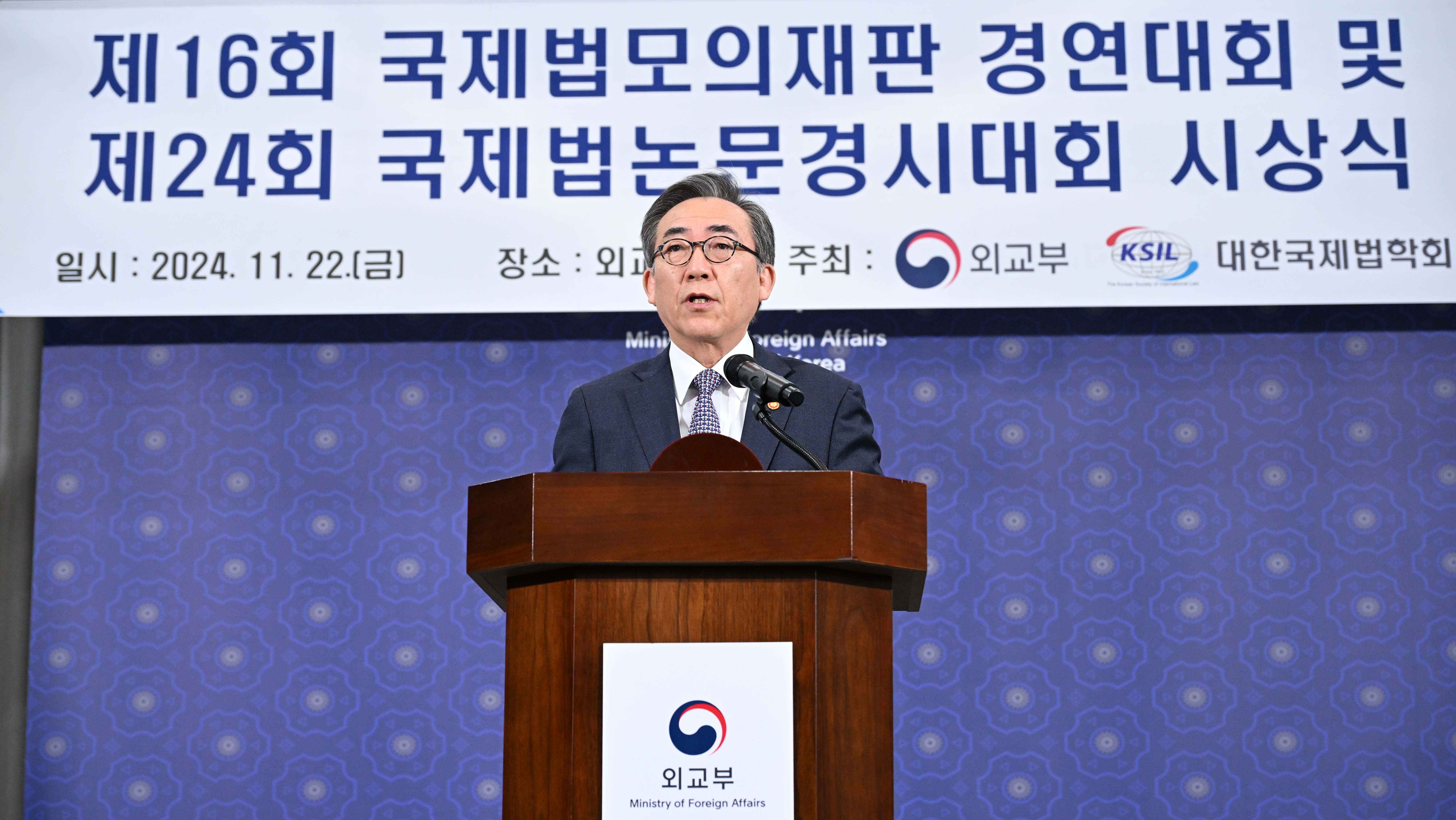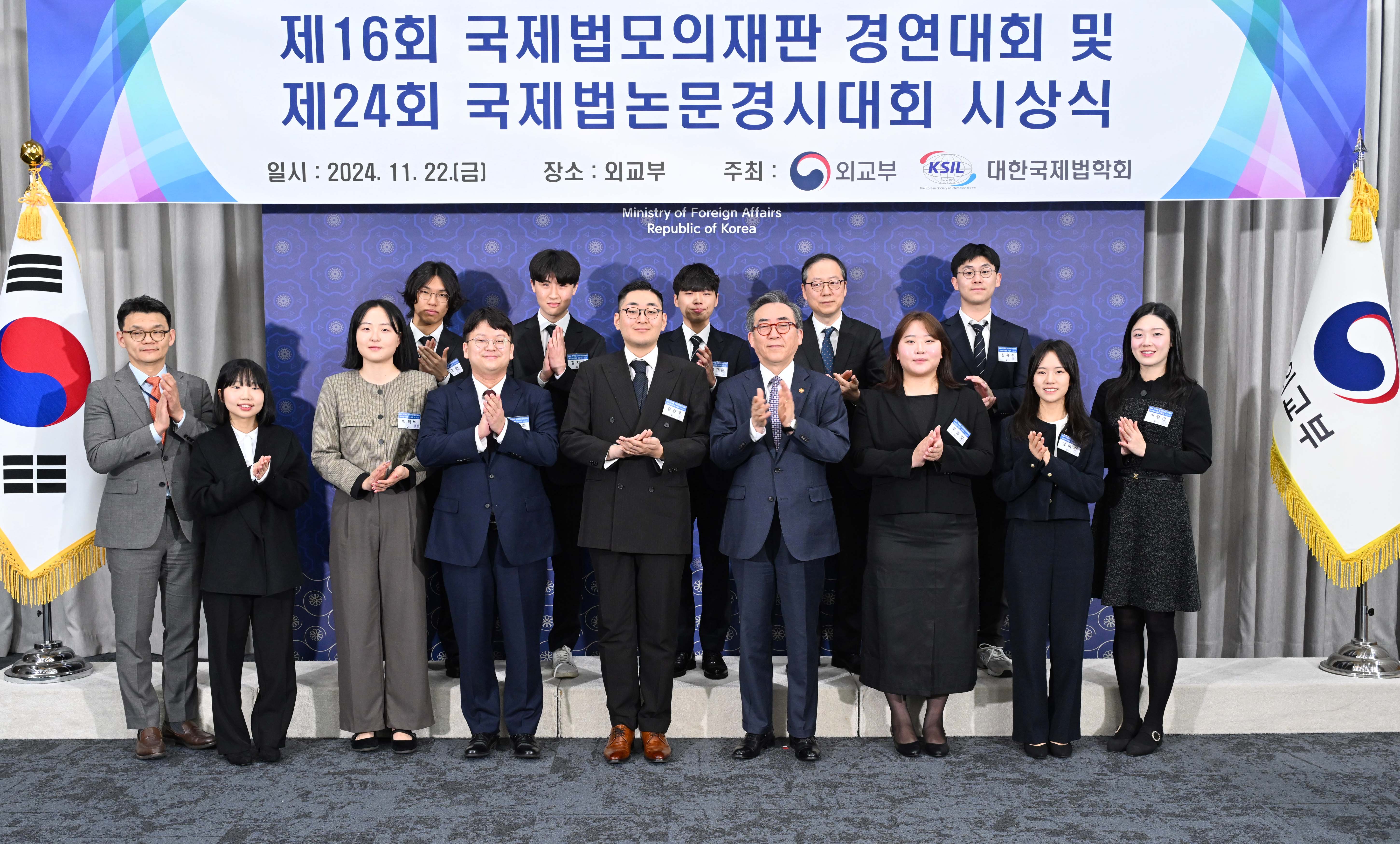 외교부와 대한국제법학회가 공동으로 주최한 ‘국제법 모의재판 경연대회’와 ‘국제법 논문경시대회’ 시상식이 11.22.(금) 오전 조태열 외교장관 및 학회 관계자들이 참석한 가운데 외교부 18층 서희홀에서 개최되었습니다.